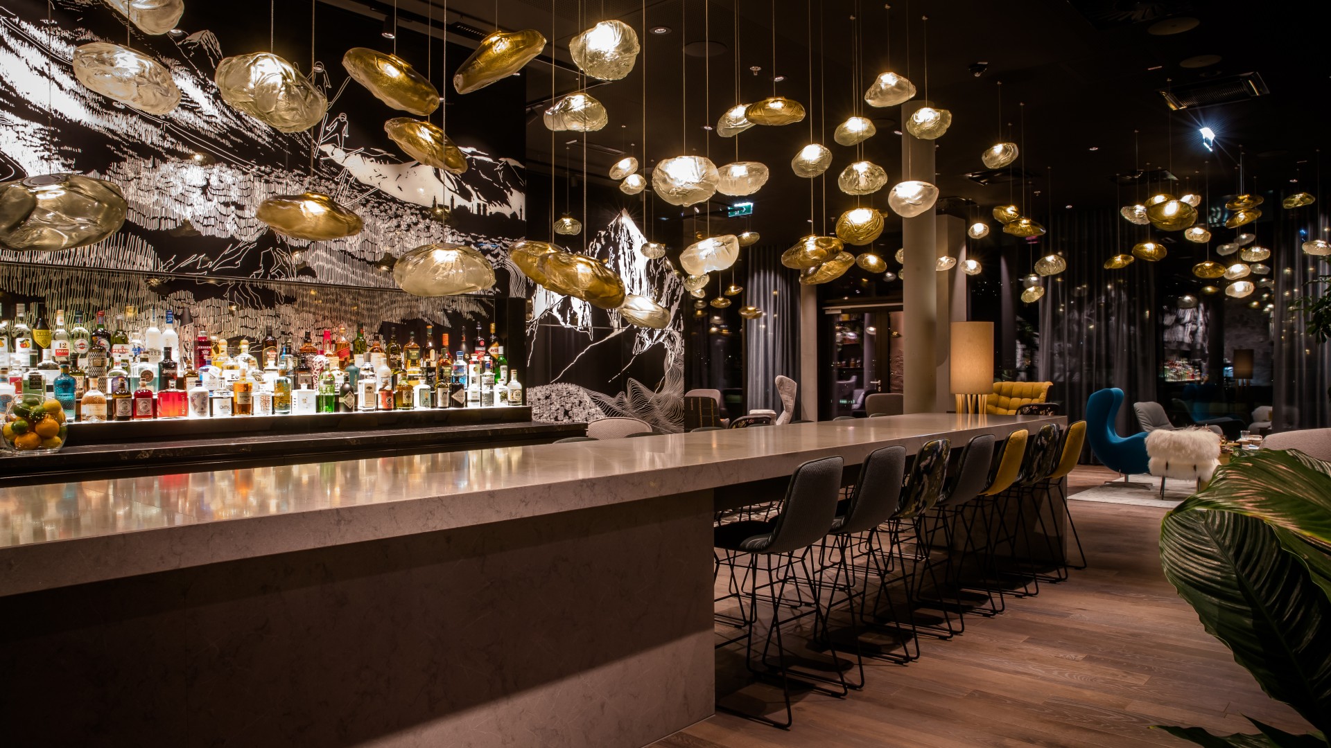 Ein akzentuiertes Lichtkonzept lädt in der Design-Panoramabar mit Blick auf die verschneiten Bergspitzen zum wohligen Verweilen ein. Die von der Künstlerin Nicole Weniger entworfene Rückwand der Bar drängt sich durch ihre dezente Ausleuchtung nicht auf, sondern ergänzt die beeindruckende Raumszenerie kunstvoll.