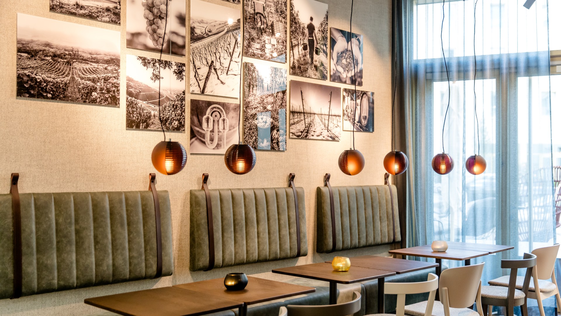 Die klassischen Rundbögen der Lobby werfen anmutige Schatten, während das Spiegelkabinett mit würfelförmigen Pendelleuchten und silbrigem Licht lockt. Lounge und Bar widmen sich thematisch dem Weinanbau in Franken und schaffen durch warme Farben und rustikale Leuchten eine Atmosphäre der Behaglichkeit.
